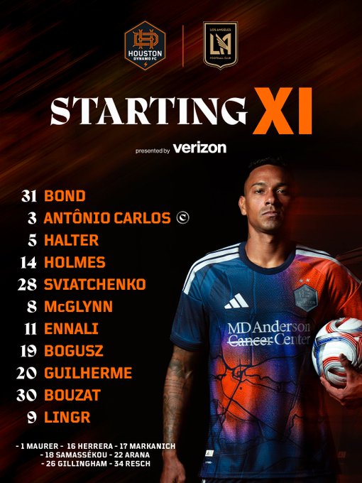 이에 맞서는 벤 올슨 감독의 휴스턴은 3-4-2-1 포메이션으로 응수했다. 조나단 본드가 골키퍼 장갑을 끼고, 루카스 할테르-안토니오 카를로스-에릭 스비아트첸코가 스리백을 이룬다. 중원에는 로렌스 엔날리-잭 맥글린-아구스틴 보자트-듀안 홈즈가 포진했다.길례르미 아우구스투와 마테우시 보구시가 2선에서 온드르제이 린그르를 지원한다.