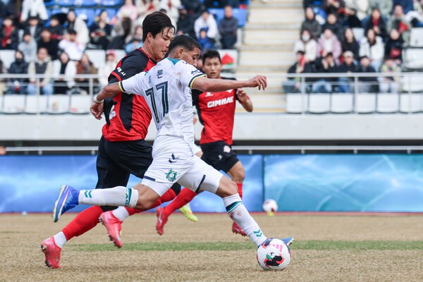 김해도 물러서지 않았다. 전반 42분, 중앙으로 연결한 패스를 끊어낸 이래준이 이를 그대로 골로 연결시키며 안산은 0-1로 끌려갔다. 선제 실점한 안산은 균형을 맞추기 위해 공세를 이어갔지만 전반전은 한 점 뒤진 채 종료됐다.