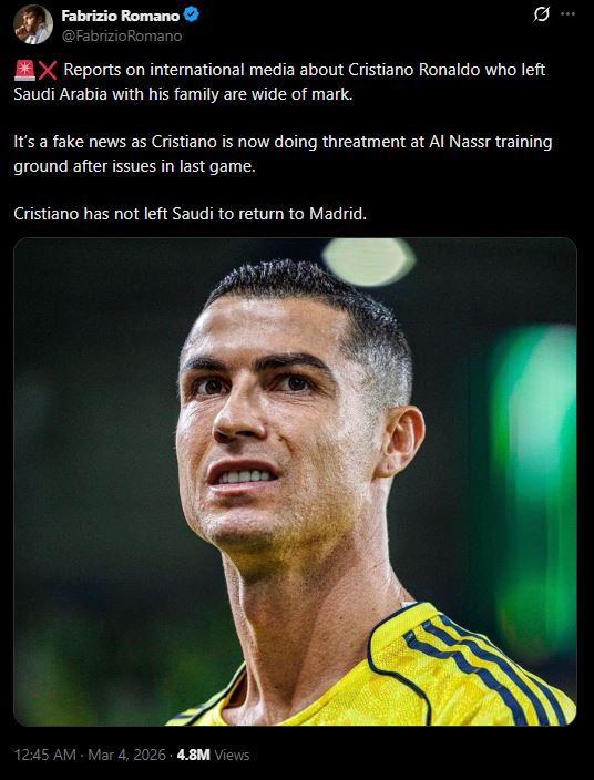 축구계 소식에 정통한 파브리시오로마노기자는 4일 자신의 SNS를 통해 "국제 언론에서 보도된 '호날두가 가족과 함께 사우디를 떠났다'는 내용은 사실과 다르다"며 "이는 가짜뉴스다. 호날두는 현재 알 나스르 훈련장에서 지난 경기 중 발생한 부상 문제로 치료를 받고 있다. 그는 사우디를 떠나 마드리드로 돌아가지 않았다"고 밝혔다.