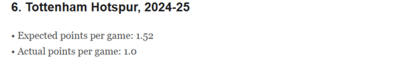 한편, 토트넘은 2024/25시즌뿐만 아니라 올 시즌 성적도 순위에 포함되며 체면을 구겼으며,이 부문 최악의 팀으로는 2015/16 애스턴 빌라 FC가 선정됐다.