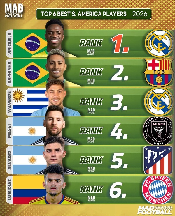 - 축구 콘텐츠 제작소 매드 풋볼은 8일(한국시간) 2026년 기준 각 대륙에서 최고의 선수 6명씩을 선정해 발표했다.