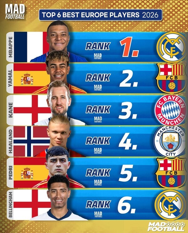 유럽 부문에서는 킬리안 음바페(레알 마드리드), 라민 야말(FC 바르셀로나), 해리 케인(바이에른 뮌헨), 엘링 홀란(맨체스터 시티), 페드리(바르셀로나), 주드 벨링엄(레알 마드리드)이 1위부터 6위까지 이름을 올렸다.