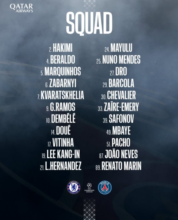 루이스 엔리케 감독이 이끄는 '디펜딩 챔피언' PSG는 경기에 앞서 16일 첼시와의 일전에 나설 22명의 선수단을 공개했다.