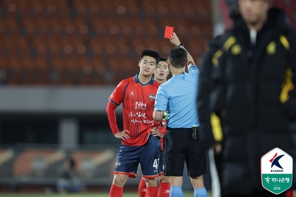 전반 6분 큰 변수가 생겼다. 이상헌이 안혁주와 볼 경합 과정에서 발 높이 들어 그의 정강이를 가격했다. 첫 판정은 경고였으나 온 필드 리뷰(VAR) 끝에 퇴장으로 바뀌었다. 김천은 수적 열세를 안고 뛰어야 했다.