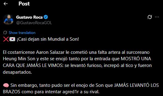 그는 "손흥민이 월드컵을 놓칠 뻔했다"며 "살라자르가 손흥민에게 거친 반칙을 범했고, 이에 손흥민은 지금까지 보지 못했던 표정으로 분노를 드러냈다. 강하게 항의하며 달려들었고, 결국 선수들이 말리며 상황이 진정됐다"고 전했다.
