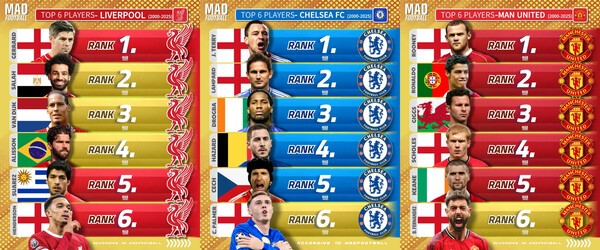 축구 콘텐츠 제작소'매드풋볼'은 18일(한국시간) "21세기 프리미어리그 '빅6' 클럽별 최고의 선수 6인을 선정했다"고 발표하며 아스널, 맨체스터 시티, 맨체스터 유나이티드, 첼시, 리버풀, 토트넘의 레전드들을 조명했다.