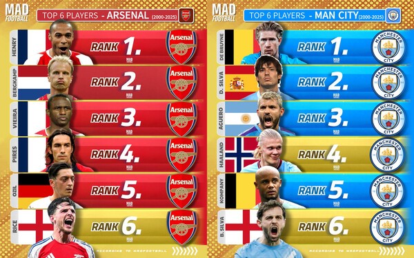 아스널은 티에리 앙리, 데니스 베르캄프, 패트릭 비에이라, 로베르 피레스, 메수트 외질, 데클란 라이스가 이름을 올렸다. 맨시티는 케빈 더 브라위너, 다비드 실바, 세르히오 아구에로, 엘링 홀란, 뱅상 콤파니, 베르나르두 실바가 선정됐다.