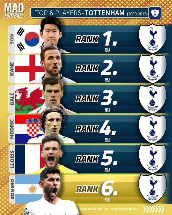 그리고 토트넘에서는 손흥민이 당당히 1위에 이름을 올렸다. 이어 해리 케인, 가레스 베일, 루카 모드리치, 위고 요리스, 크리스티안 로메로가 뒤를 이었다.