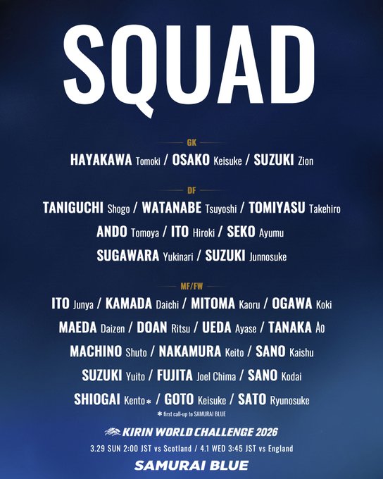 일본은일본은 오는 29일(이하 한국시간) 스코틀랜드(글래스고, 햄든 파크)와 평가전을 치른 뒤, 4월 1일잉글랜드(런던, 웸블리 스타디움)와 격돌한다.