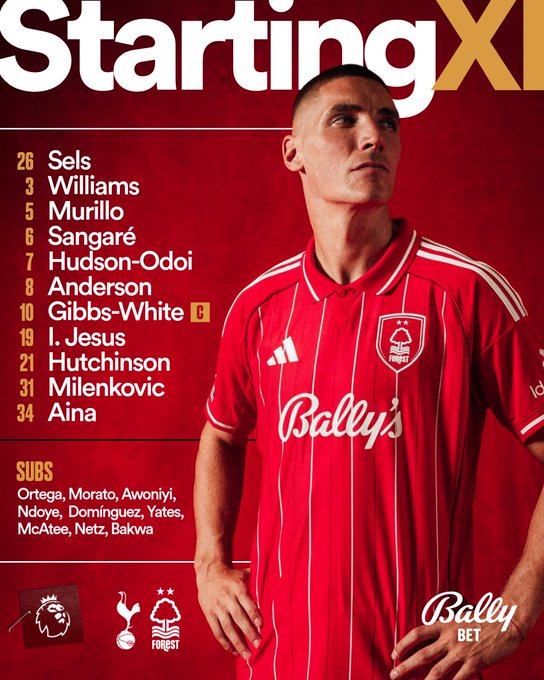 이에 맞서는 노팅엄 포레스트는 4-2-3-1 포메이션으로 나섰다. 마츠 셀스가 골키퍼 장갑을 꼈고, 니코 윌리엄스-제이슨 무리요-니콜라 밀렌코비치-올라 아이나가 수비라인을 구축했다. 중원에는 엘리엇 앤더슨과 이브라힘 상가레가 위치했고, 2선에는 칼럼 허드슨-오도이, 모건 깁스-화이트, 오마리 허친슨이 배치됐다. 최전방에는 이고르 제주스가 나섰다.