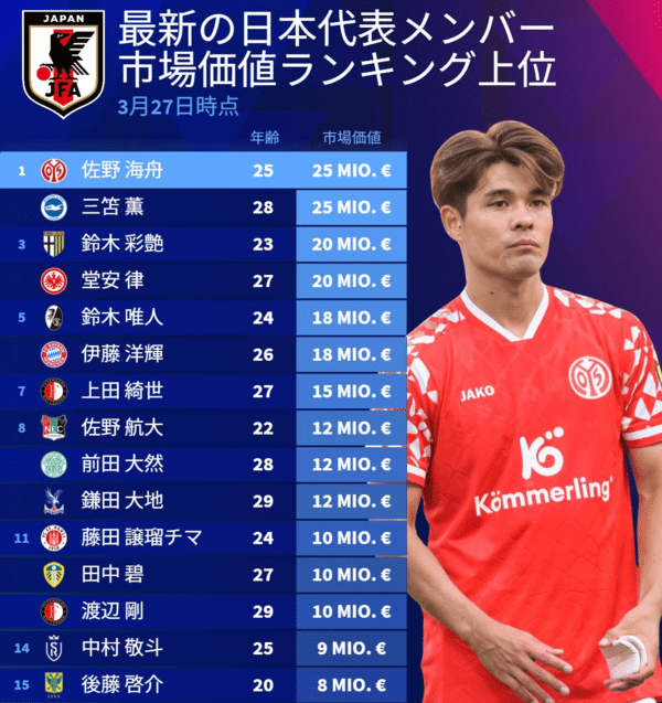 일본 매체 '트랜스퍼마크트'는 27일(한국시간) 사회관계망서비스(SNS)를 통해 일본 국가대표 선수들 가운데 시장가치 상위 자원들을 추려 공개했다.