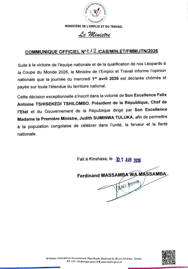 콩고민주공화국 고용노동부는 1일(이하 한국시간) 공식 채널을 통해 "대표팀의 승리와 2026 국제축구연맹(FIFA) 북중미 월드컵 진출을 기념해, 2026년 4월 1일을 전국 단위 유급 공휴일로 지정한다"고 발표했다.