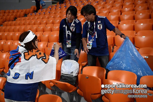 주목을 받은 건 경기력뿐만이 아니었다. 관중석에서도 일본의 품격이 드러냈다. 매체에 따르면 일본 팬들은 경기 종료 후 원정석에 남아 직접 쓰레기를 수거하며 자리를 정리한 뒤 경기장을 떠났다.