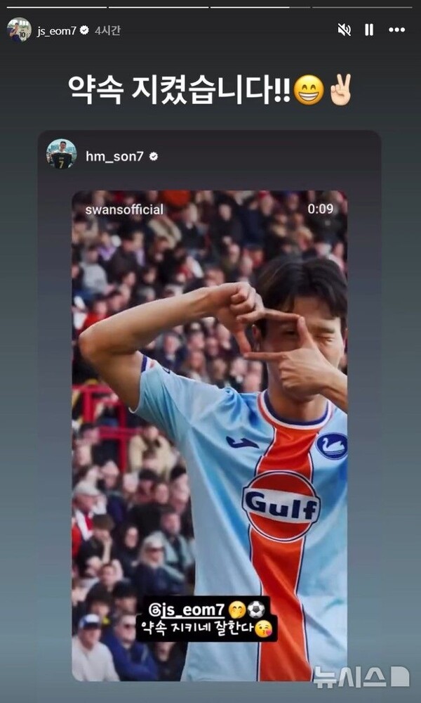 실제로 엄지성의 골 이후 손흥민은 자신의 SNS에 해당 장면을 공유하며 "약속 지키네, 잘한다"는 메시지를 남겼고, 엄지성 역시 "약속 지켰습니다"라며 화답해 훈훈한 장면을 연출했다.
