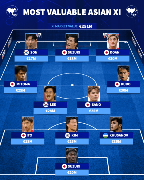 실제로 아시아의 경우 무려 11명 중 7명이 일본 선수였다. 몸값 역시 가장 비싼 선수는 3,500만 유로(약 608억 원)의 후사노프이나 일본이 무려 7명이나 차지하며 1억 5,600만 유로(약 2,710억 원)에 달했다.