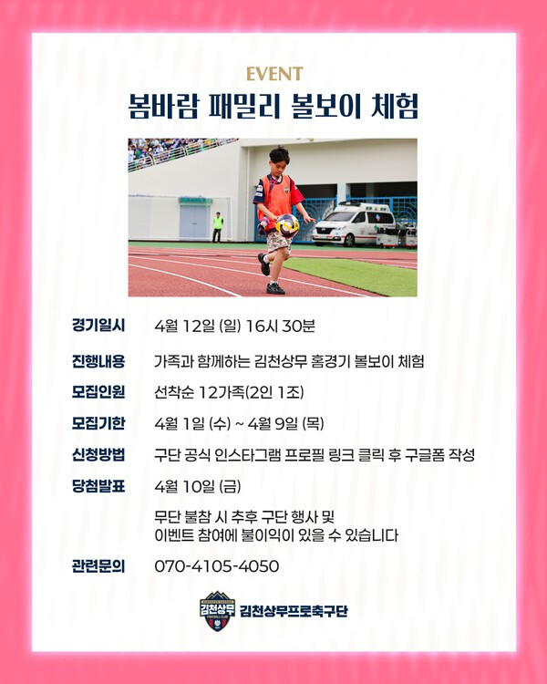 김천상무는 오는 홈경기 완연한 봄을 알리는 이벤트로 홈팬을 맞이한다.먼저 선수들과 함께하는 봄소풍 이벤트가 열린다.사전 모집된 총30팀을 대상으로 진행되며,선수들과 함께하는 포토타임,피크닉 세트 증정,레크리에이션을 즐길 수 있다.신청 마감은4월8일까지다.이어4월9일까지 구단SNS를 통해 신청 시 패밀리 볼보이 체험,봄Kick Off가족 시축,패밀리 에스코트 등 다양한 이벤트에 참여할 수 있다.