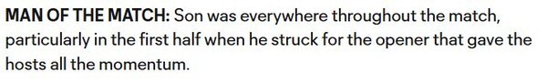 - 그러면서 손흥민을 수훈 선수(MAN OF THE MATCH)로 꼽으며 손흥민은 경기 내내 그라운드 곳곳을 누볐다.
