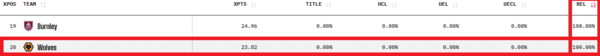 '옵타'의 슈퍼컴퓨터는 울버햄튼의 강등 확률을 무려 '100%'로 점쳤다. 번리 FC(100%)와 함께 사실상 강등이 확정됐다고분석했으며,토트넘 홋스퍼 FC(49.50%)와 웨스트햄 유나이티드 FC(38.78%)가 뒤를 이었다.
