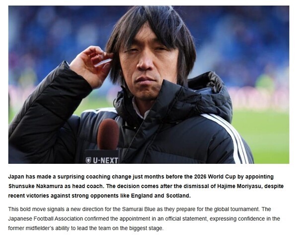 이는 삽시간에 각종 사회관계망서비스(SNS) 등을 통해 퍼지며 이목을 끌었다.심지어 '아프리카 톱 스포츠'는 "일본은 2026년 월드컵을 불과 몇 달 앞두고 나카무라를 사령탑으로 선임하며 놀라운 감독 교체를 단행했다. 이번 결정은 최근 잉글랜드와 스코틀랜드 등을상대로 승리를 거두었음에도모리야스 감독이 경질된 데 따른 것"이라고 구체적인 정황을 덧붙였다.