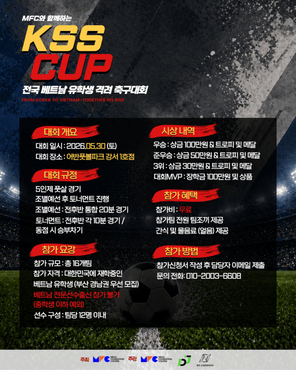 [SPORTALKOREA] 김경태 기자=전국 베트남 유학생을 위한 축구대회 'KSS컵'이 오는 5월 30일 부산에서 개최된다. 김상식 감독의 이름을 내건 이번 대회는 스포츠를 매개로 한국과 베트남을 잇는 교류의 장이자, 유학생을 응원하기 위한 사회공헌 프로젝트로 기획됐다.